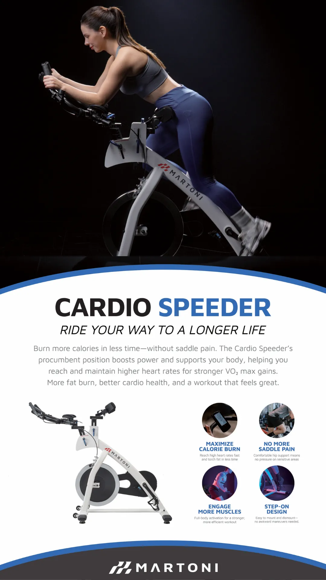 Martoni is an innovative fitness and e-mobility company dedicated to revolutionizing the riding experience through its proprietary "procumbent" technology. By reimagining traditional ergonomics, Martoni eliminates common pain points such as back, wrist, and saddle strain, offering a high-performance alternative that feels more like "flying" than cycling. The brand's flagship products include the Cardio Speeder, a seat-free high-intensity spin bike designed for a full-body workout, and the Super E, a stylish electric bike engineered for effortless, aerodynamic urban commuting. Martoni is bridging the gap between cutting-edge fitness equipment and everyday mobility, inviting riders to experience the future of comfort and power.